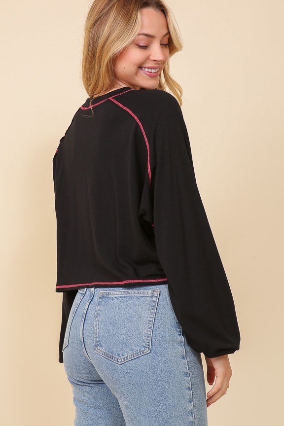 A top that has a long sleeve, round neck, and is exquisitely adorned with contrast-stitched details, all the while boasting an oversized silhouette that is sure to make a fashionable statement. Perfect for the gym, morning runs, casual outings, tailgates, game day, bbqs, fall cozy days.