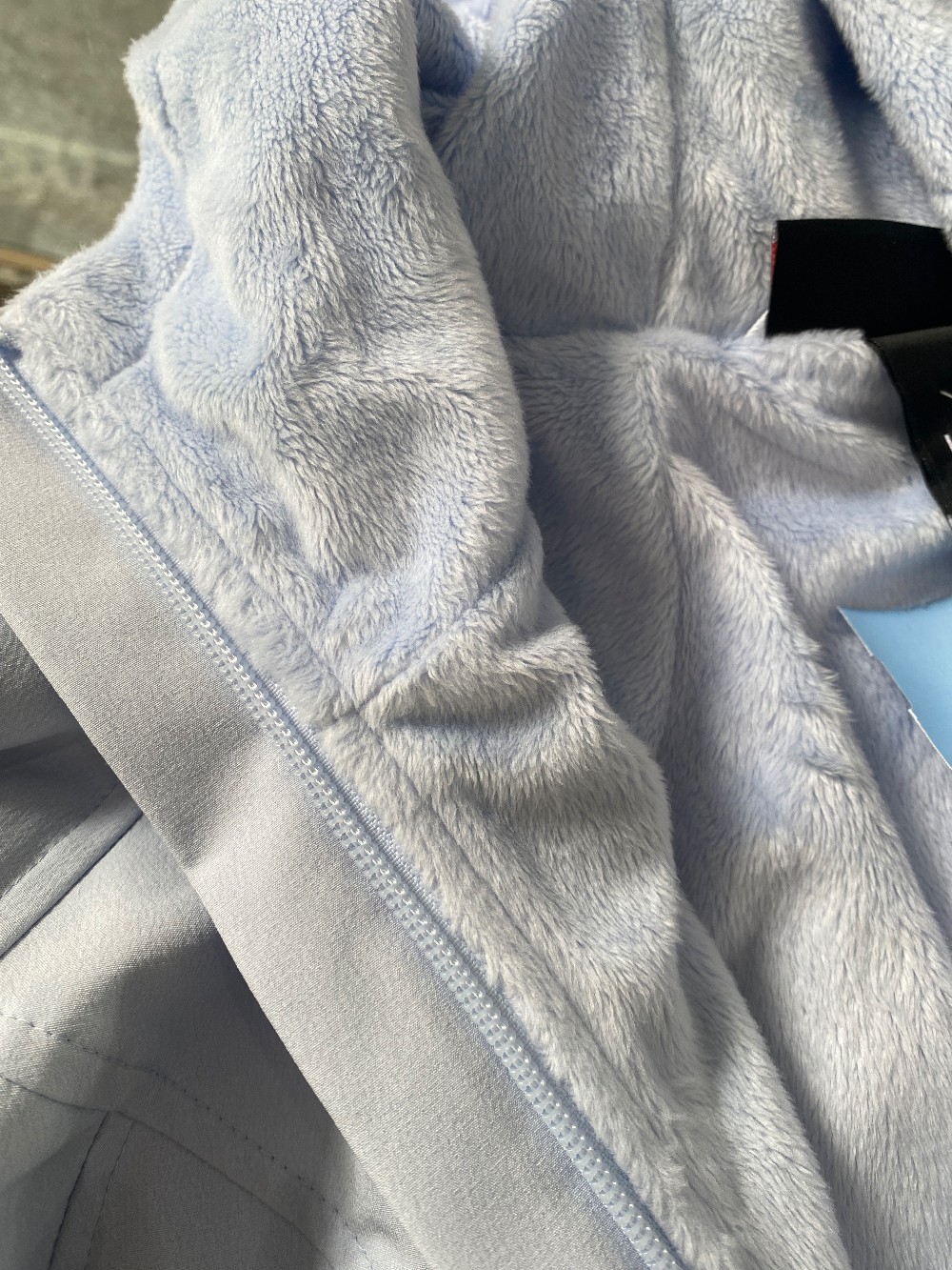 Kirkland double lined soft shell full zip jacket. Fleece interior. Hooded. Hand pockets. Size Large. Shell: 90% Polyester 10% Elastane Lining: 100% Polyester Chest 44" armpit to wrist sleeve 21" body length 27" Ferndale Location