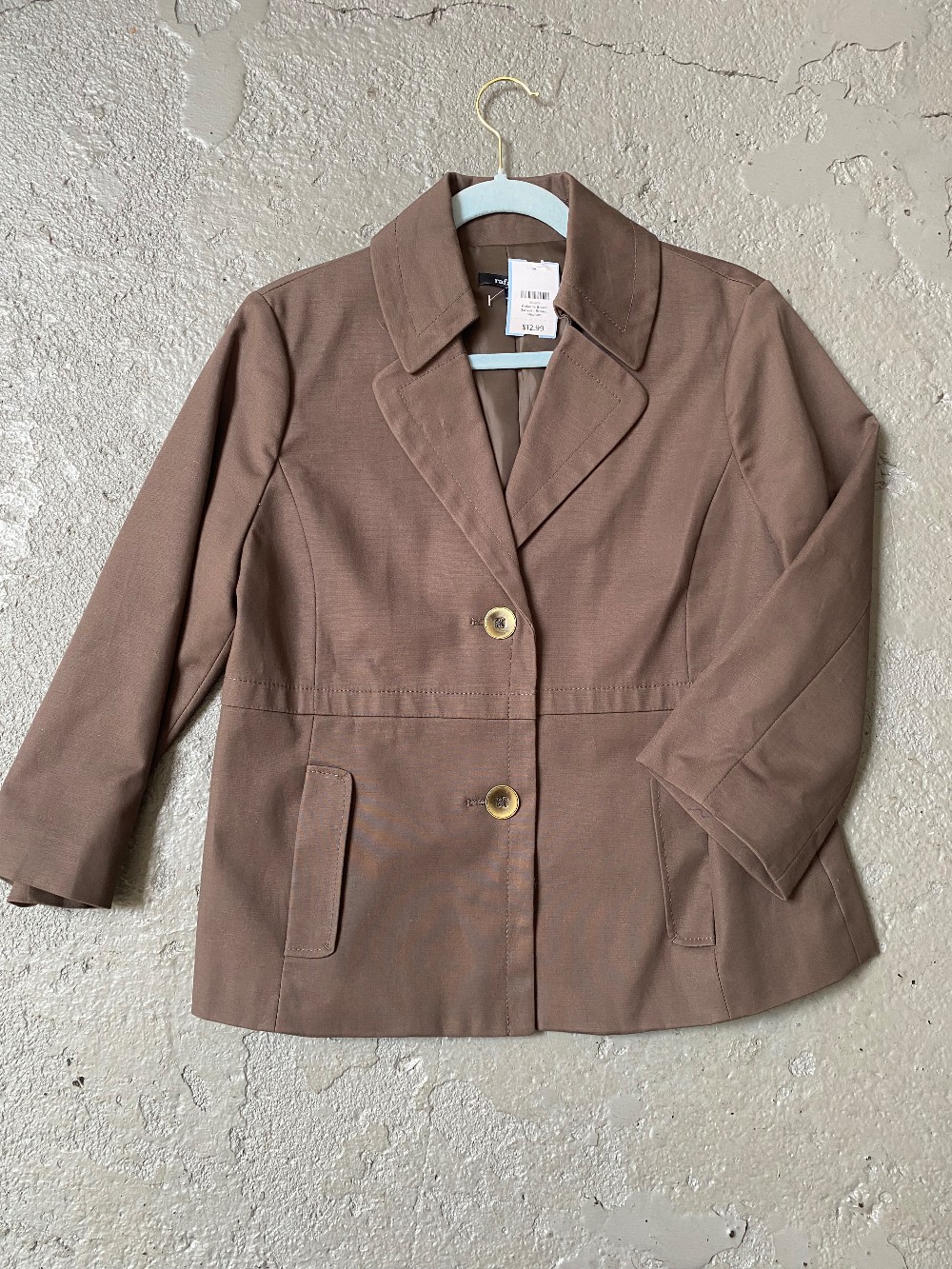 2 side pockets, 2 button closure. Double lined. Shell: 63% Cotton 34% Polyester 3% Spandex Lining: 100% Polyester 38' Chest 18.5" Sleeve 23.5" body length