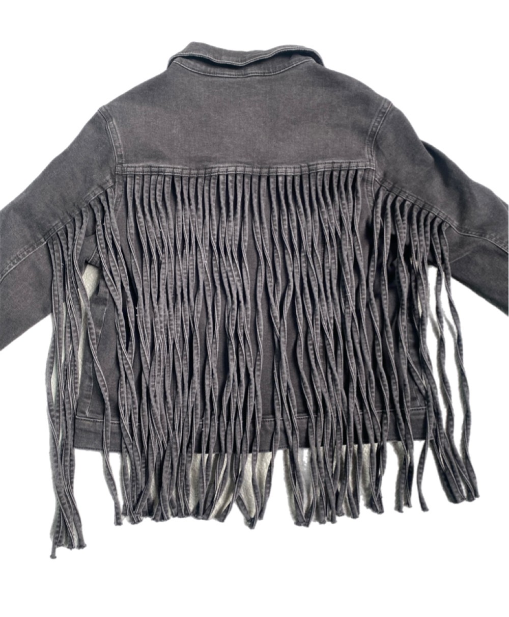 Black denim jacket with back fringe detail. Button down closure with 2 chest pockets and button sleeve. Made in Turkey 98% cotton 2% elastane chest 38" pit to wrist sleeve 17.5" body length 20.5" fringe is about 18" long