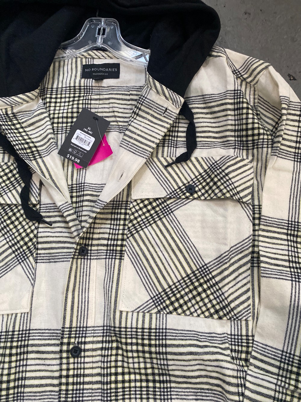 New With Tags. Plaid Flannel, Hooded with drawstring. 2 chest pockets. Chest 51" Sleeve 26.5" Body Length 32"